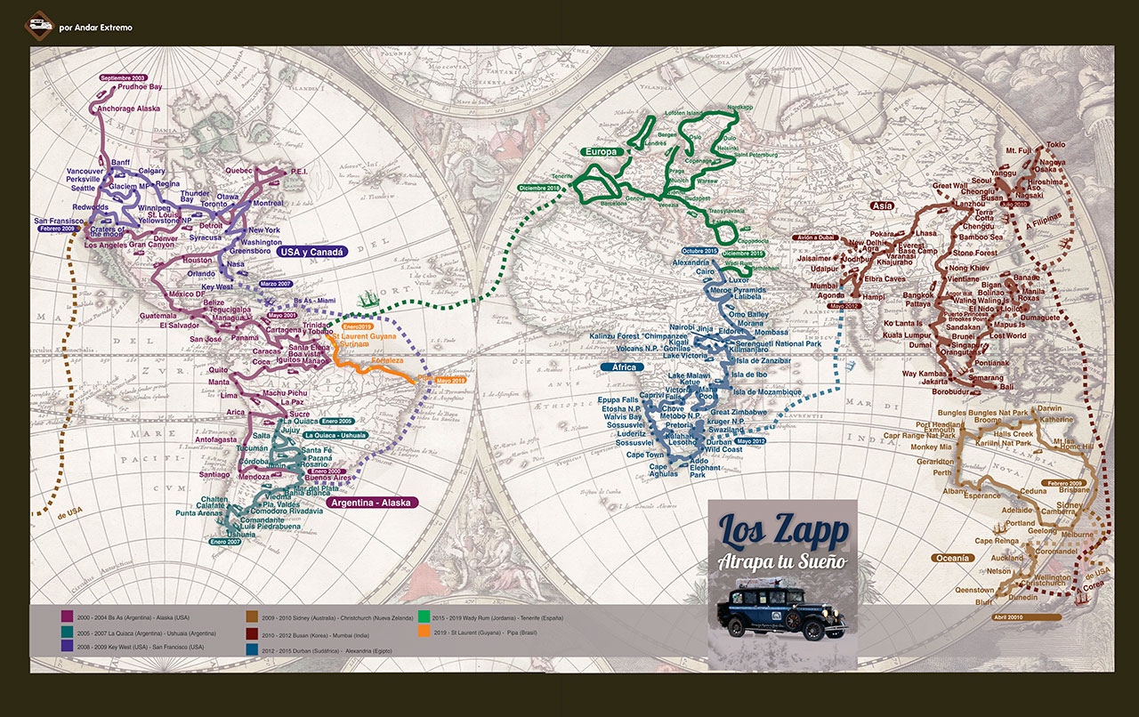 Su libro “Atrapa tu sueño”, con 13 ediciones en español y 6 en inglés, les permite financiar el viaje. Arriba, el mapa de los Zapp, con el trazo de estos 19 años recorriendo el mundo.