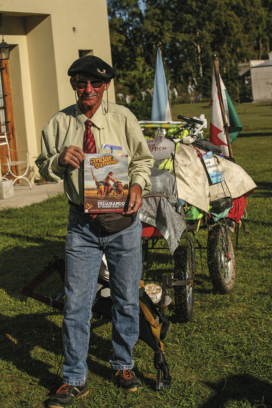 Martín hace todos los días una distancia que ronda entre los 30 y 40 km. Padre de tres hijas, abuelo de 5 nietos, vive en Trelew con su mujer, pero su deseo hizo que arme un carro de 2 metros de largo (llega a 3 metros con el arnés), y unos 60 cm de ancho, y que el 31 de octubre de 2017 comience a caminar su historia, yendo a dedo hasta Ushuaia.