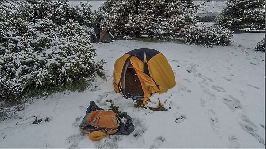 Tras un día lleno de emociones, me entregué al descanso en mi carpa, sumiéndome en un sueño sin tiempo. En medio de la noche, sentí cómo se sacudía, pero opté por ignorarlo y me dejé llevar por un sueño profundo. Al despertar, la luz del amanecer reveló una sorpresa: 20 centímetros de nieve habían caído, explicando los misteriosos movimientos nocturnos que no eran más que la nieve acumulándose sobre mi refugio. Consciente del tiempo, me apresuré a empacar, listo para tomar el autobús hacia el aeropuerto, llevándome el recuerdo de una mañana inesperadamente blanca.